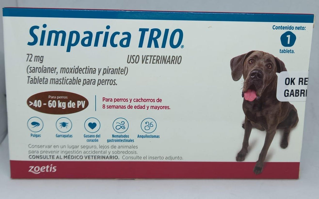 Fórmula: Cada tableta contiene Sarolaner 72 mg, Moxidectin 1.44 mg y Pyrantel 300 mg.